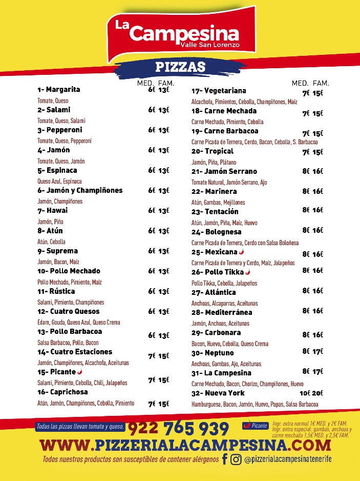 Introducing the menu of Pizzería La Campesina: Located in Valle de San Lorenzo, Santa Cruz de Tenerife, Pizzería La Campesina offers a delightful culinary experience centered around pizza and traditional Venezuelan dishes. Their menu features an impressive array of arepas, including flavors like Jamón y Queso Amarillo and Pollo Desmechado, all priced at just €5.00. Entrées such as 100 Chicken Nuggets and Tequeños de Queso Blanco cater to those seeking comfort food.